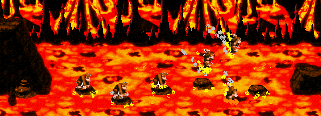 I've always wondered how ropes worked in DKC2/3. Horizontal ones seem to be based on floor tiles (the animation of a Kong jumping speeds up while landing on one (more noticeable with Dixie's hair), and that's what happens when you land); but I never understood why the following Kong caught up with the leading one, as if it were a platform [?]