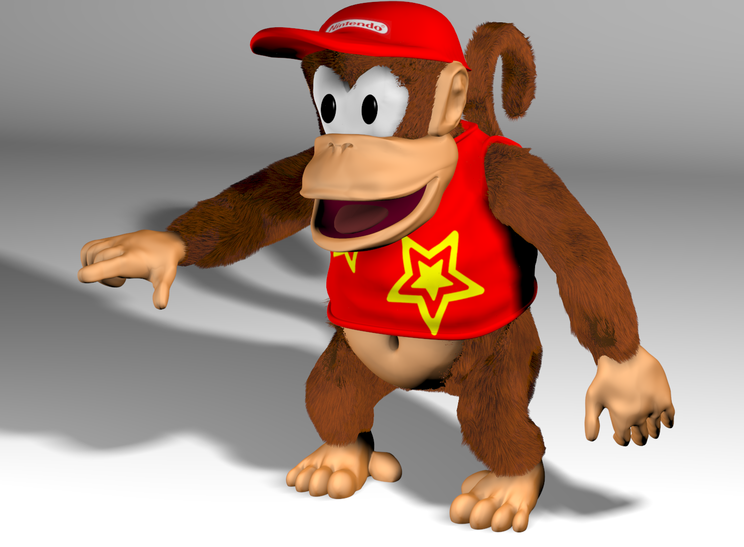Here is an updated version of Diddy. Did a more detailed rig(still rough) to allow for a better pose and made his eyes slightly smaller. I looked at some reference and his eyes were actually smaller. I did have the fur decent but I had to rotate his left arm for the pose and you can see where I didn't comb it as nicely. *** the fur. Its a pain.