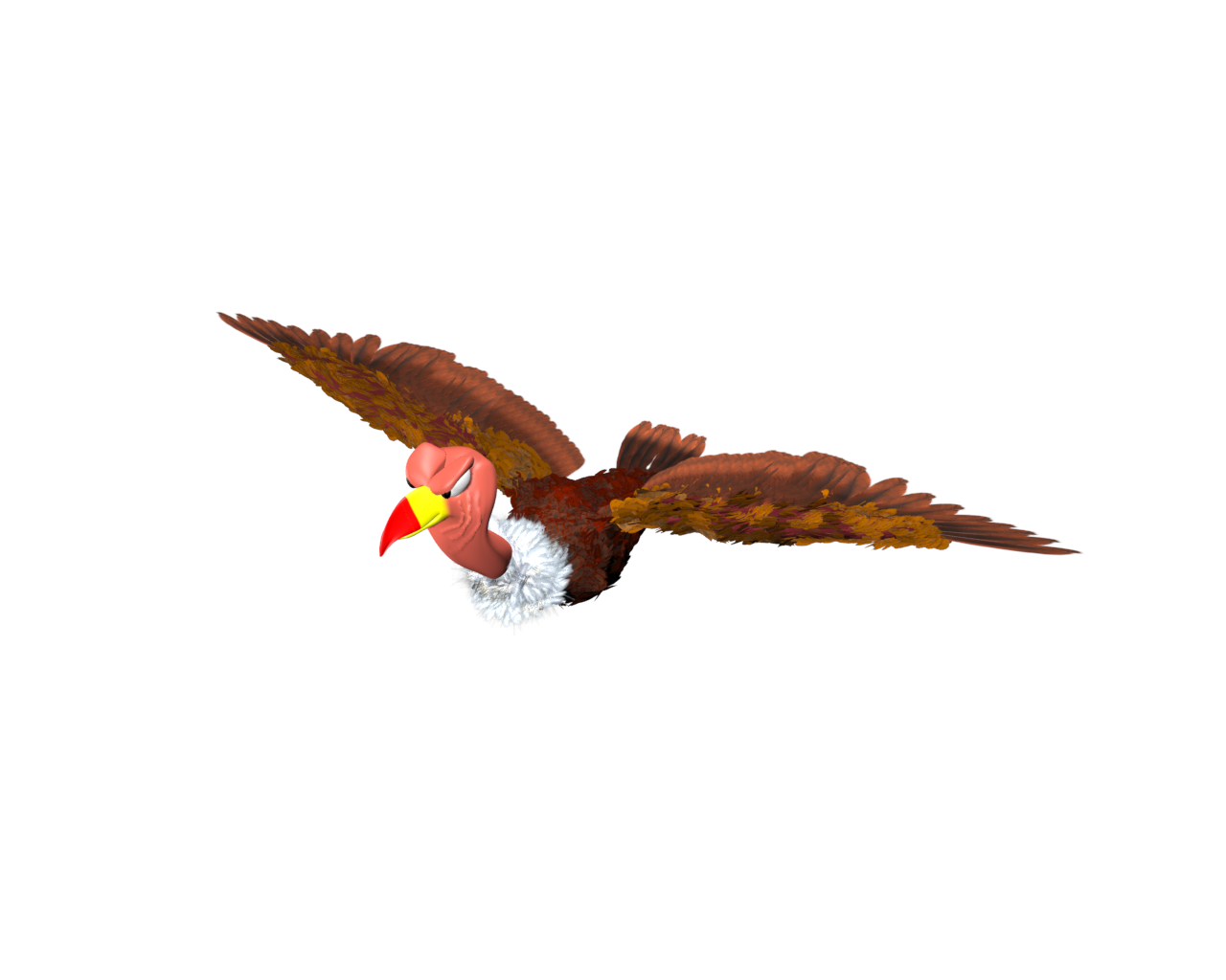 Here is a new version showing a different angle and with fixed feathers. Still a few not following the rules. Bad feather you. Also this is a wrong pose as his body is in a flying pose not standing like a bird would be doing with his wings folded like that. Still need to rig the body, neck and feet.