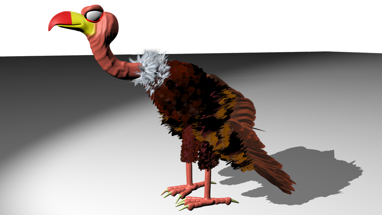 The feathery texture on Sqwawks I used particle objects that were attached to the mesh using Particle Flow. Necky is using feather objects distributed with the hair/fur modifier. Similar approaches but different tools.