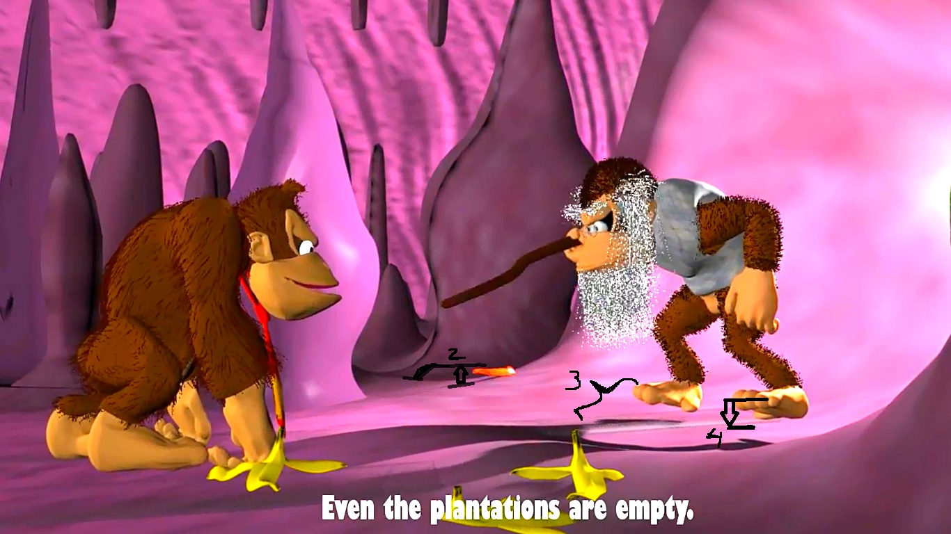1. For DK's angry face, have his eyes be looking at Cranky instead of down at the ground.