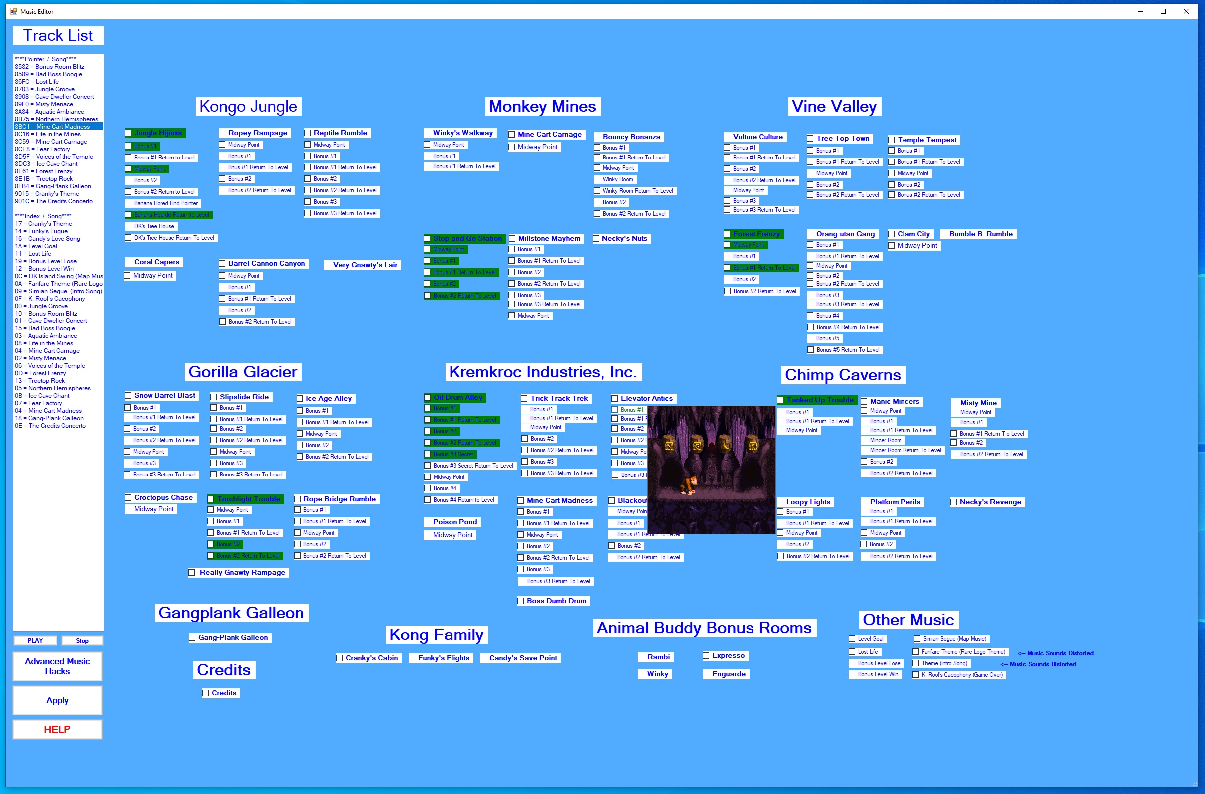 - A thumbnail image is displayed when you hover over a a "level" checkbox so you know what area's music you are changing.