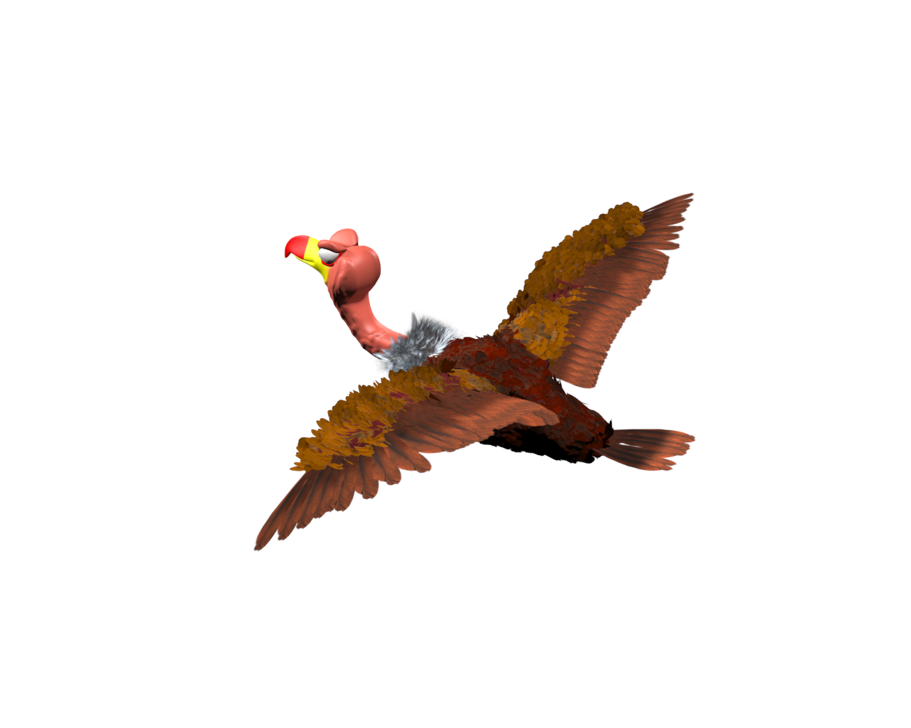 Here is a new version showing a different angle and with fixed feathers. Still a few not following the rules. Bad feather you. Also this is a wrong pose as his body is in a flying pose not standing like a bird would be doing with his wings folded like that. Still need to rig the body, neck and feet.